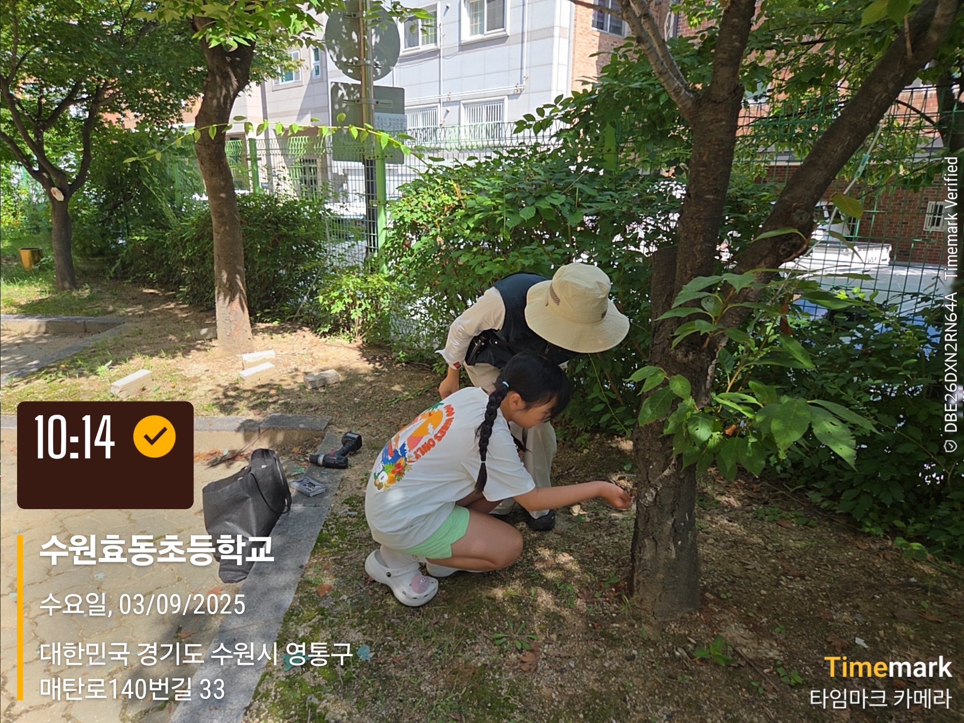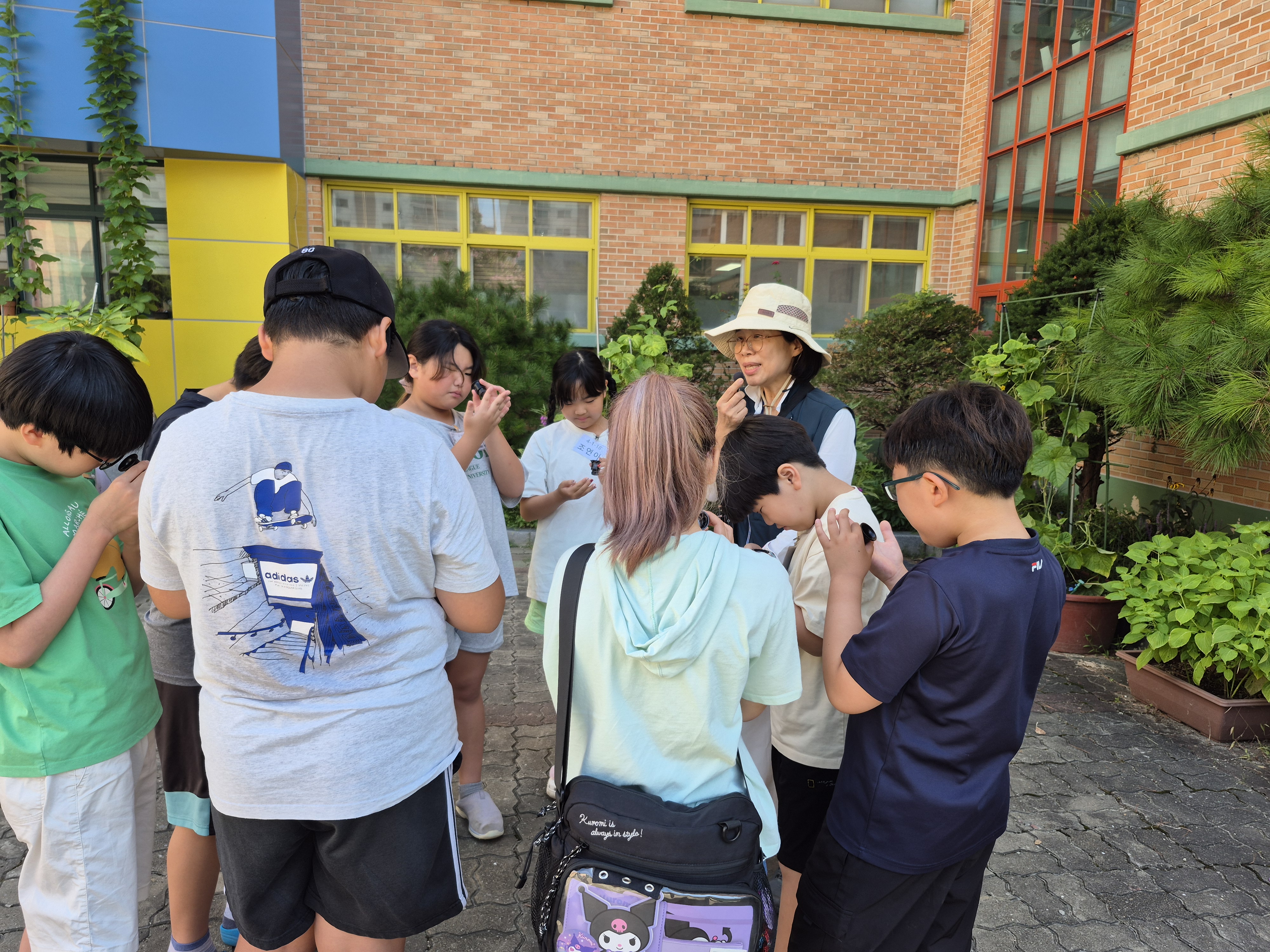 효동초등학교(9월3일, 1회차)에서 루페(확대경)로 나무잎 상태를 살펴보는 학생들